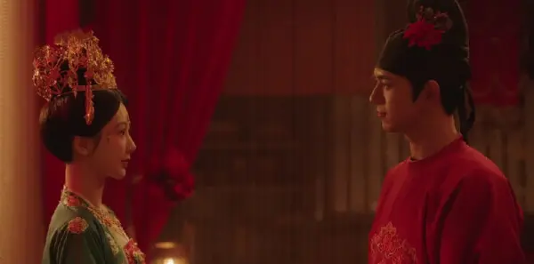 蒋长扬和牡丹按照礼制,进行了却扇礼、沃盥礼,还有同牢礼和合卺酒,接下来就是结发洞房。牡丹在房内给蒋长扬宽衣,蒋长扬则替她摘下头饰、梳头,他们修身尊礼,一一将该有的礼数完成。牡丹的头发好不容易长出来,不愿剪下头发,蒋长扬并不在意,他把自己的头发放在香囊中,等牡丹什么时候梳发掉了几根再放进去也行,此乃结发。冯夫人命人快马加鞭送回玉梳,不是什么贵重物品,牡丹坦然收下,却不知这竟是蒋长扬生母的贴身之物,她还在世时,打算以此物赠给蒋长扬以后的夫人。