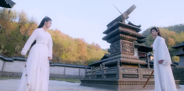 小女孩继续打探上山的路,因为父亲上山和人比拼,她不放心,小男孩也想起师傅今天也在山顶和人比拼,猜想可能是小女孩的父亲,小女孩提出一起上山观战,但男孩坚持不去,因为师尊命令让他等着回来。